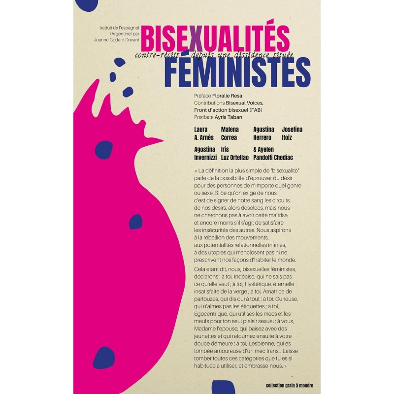 Ce recueil affirme et célèbre la bisexualité comme puissance politique et identité légitime à rebours de l'injonction monosexuelle, en offrant un aperçu des luttes et stratégies bies & féministes argentines de ces dernières années. Point de rencontre de multiples voix portenas - militantes, académiques, poétiques -, c'est une pluralité de témoignages qui nous est présentée afin d'accompagner la naissance et la construction de représentations dont nous manquons. Ces écrits réaffirment la valeur des identités érotiques et amoureuses polysexuelles tout en dénonçant la biphobie engendrée par l'histoire unique cis-hétéro patriarcale mais parfois perpétuée au sein même du mouvement LGBTQIA+. Autrices : Laura A. Arnés, Malena Correa, Agustina Herrero, Agostina Invernizzi, Josefina Itoiz, Iris Luz Ortellao, Ayelén Pandolfi Chediac Préface de Floralie Resa